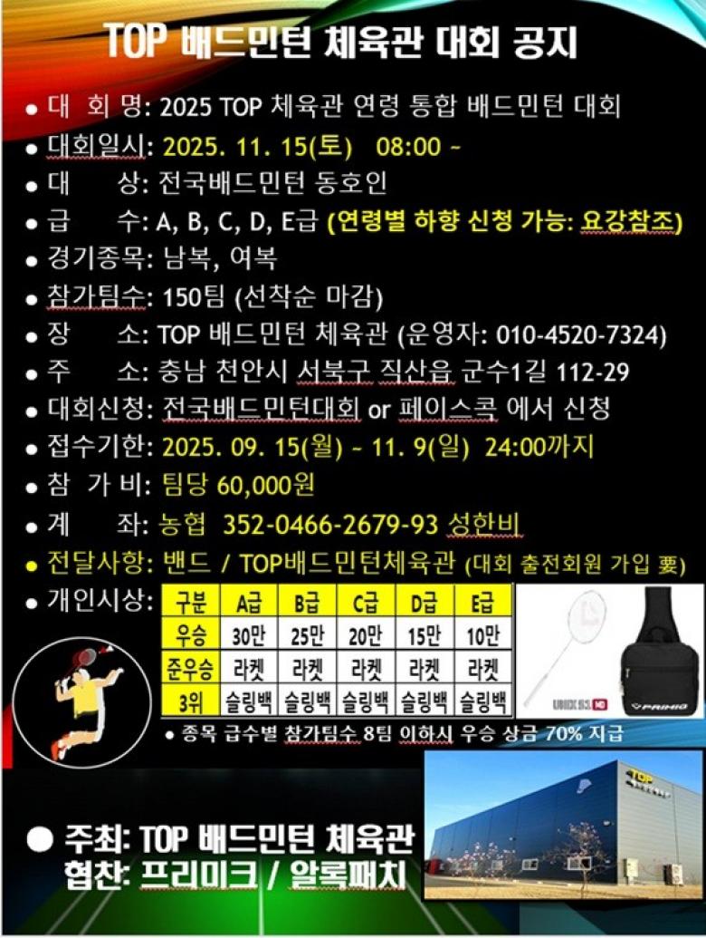 대회장소 | TOP배드민턴체육관 (천안시 직산읍 군수1길 112-29 ) |